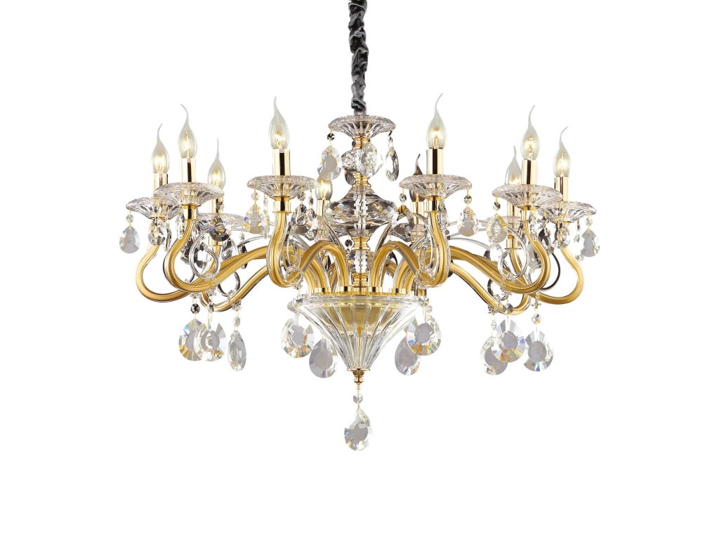 Závesné svietidlo Negresco z kolekcie dizajnového osvetlenia značky Ideal Lux v krištáľovom prevedení s desiatimi ramenami a priemerom 85 cm je ideálnou voľbou na osvietenie obývacej izby, jedálne či kuchyne. Zároveň sa skvele hodí do hotelových interiérov. Rám svietidla je zhotovený z kvalitného kovu so zlatou povrchovou úpravou. Ramená sú vyrobené z fúkaného skla so zlatistým vnútrom. Telo je zložené z brúsených krištáľových útvarov a je dekorované čírym sklom a krištáľovými oveškami. Ramená sú osadené päticami E14 pre žiarovky s maximálnym príkonom 10 x 40 W. Zdroje nie sú súčasťou balenia. Odporúčame zvoliť LED filamentové žiarovky v tvare sviečky na úsporu elektrickej energie. Krytie IP20 je vhodné pre vnútornú inštaláciu. Celkové rozmery svietidla sú 110 x 85 x 85 cm. Výšku závesu je možné regulovať od 70 do 110 cm. Prívodná reťaz je krytá šedou zamatovou tkaninou. Svietidlo je určené na napájanie zo siete na 220-240 V.Dodatočné parametre