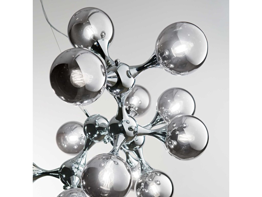 Závesné svietidlo Nodi SP15 z kolekcie interiérového dizajnového osvetlenia Ideal Lux vo väčšom prevedení s priemerom 105 cm dostatočne rozsvieti Vašu jedáleň, obývaciu izbu či kuchyňu, a skvele sa hodí aj do reštaurácií či hotelov. Jeho základňa s priemerom 10cm a nadčasovo tvarovaný rám sú vyrobené z kovu s chrómovou povrchovou úpravou. Svietidlo je vyrobené z otočných spojovacích prvkov, ktoré je možné usporiadať podľa Vašich predstáv, na ktorých je umiestnených 15 chrómových sklenených difúzorov v tvare gulí s päticou E14 o maximálnom príkone žiaroviek 15 x 40 W. Zdroje nie sú súčasťou balenia, dodávateľ odporúča zvoliť LED filamentové žiarovky40. teplotou chromatickosti 3000K (neutrálne žlté svetlo) a svietivosťou 430lm. Dĺžka závesu svietidla sa dá ľahko nastaviť od 60cm do 140cm dĺžky. Krytie IP20 je určené na vnútorné použitie.Dodatočné parametre