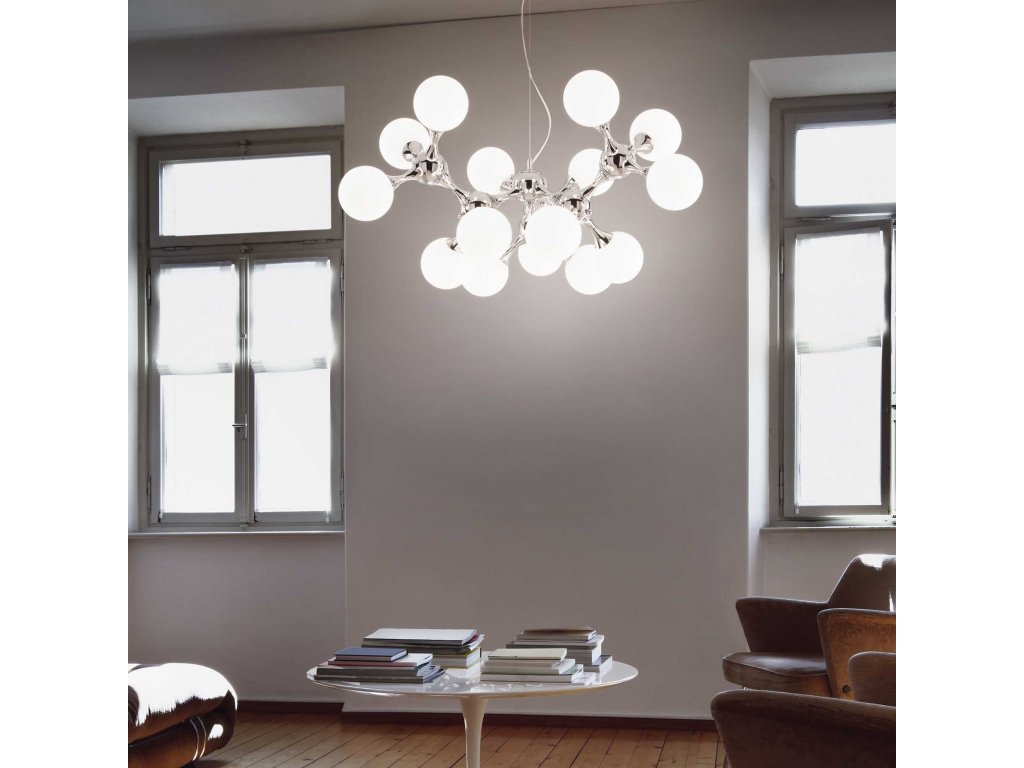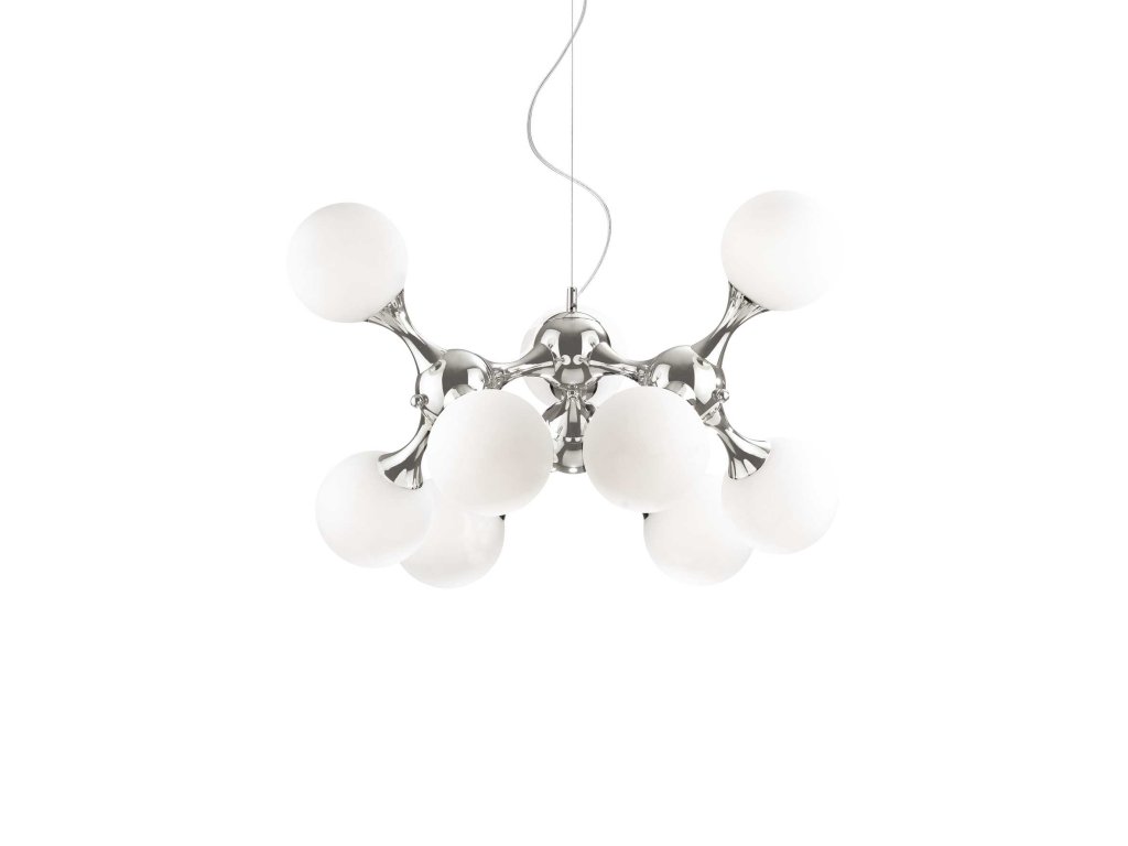 Zaujímavé závesné svietidlo Nodi z kolekcie dizajnového osvetlenia značky Ideal Lux v lesklo chrómovej farbe vhodné ako hlavné svetlo do jedálne, kuchyne či obývačky. Svietidlo tvorí guľatá základňa a tvarované telo s deviatimi ramenami, ktoré sú zhotovené z kvalitného kovu. Na konci každého ramena sú umiestnené okrúhle biele difúzory z fúkaného skla leptaného kyselinou, ktoré sú osadené päticami E14 pre žiarovky s maximálnym príkonom 9 x 40 W. Zdroje nie sú súčasťou balenia. Odporúčame zvoliť LED žiarovky na úsporu elektrickej energie. Krytie IP20 je vhodné na použitie do interiéru. Celkové rozmery svietidla sú 262 x 80 x 80 cm. Výšku závesu je možné regulovať od 53 do 262 cm. Svietidlo je určené na napájanie zo siete na 220-240 V.Dodatočné parametre