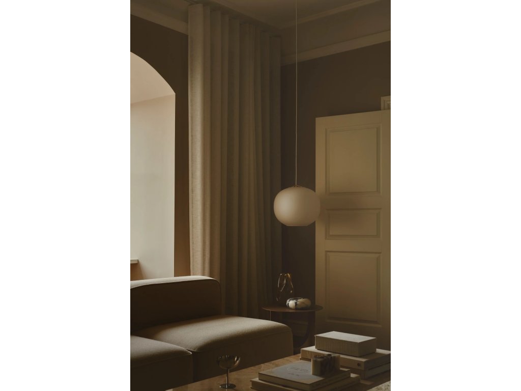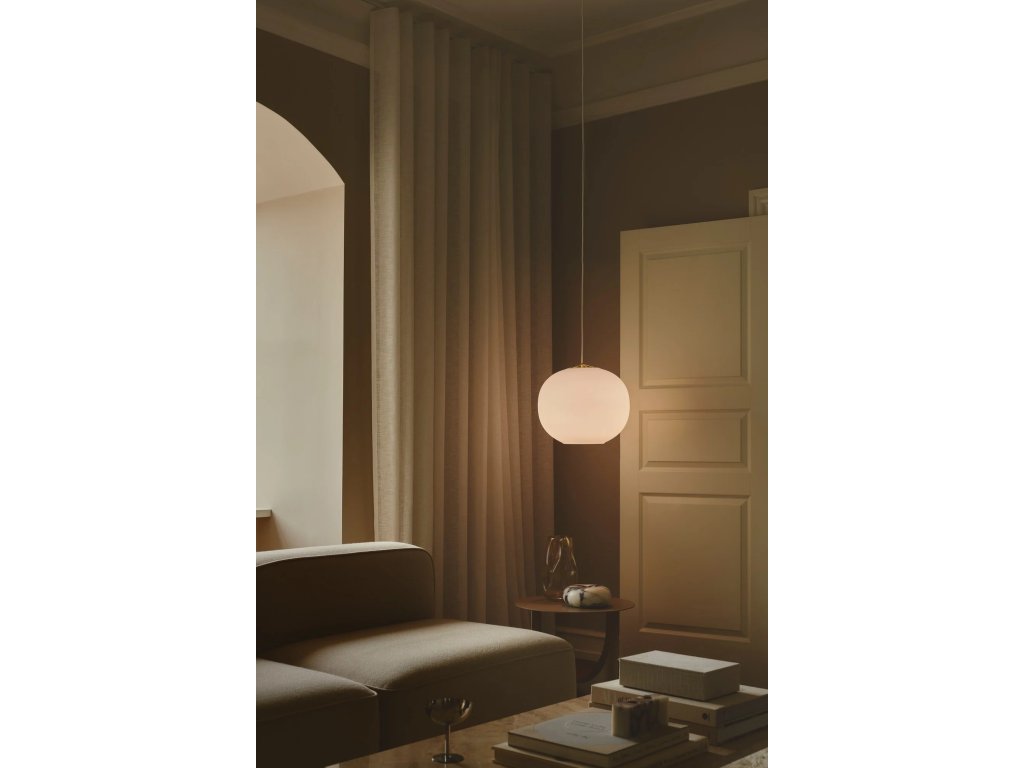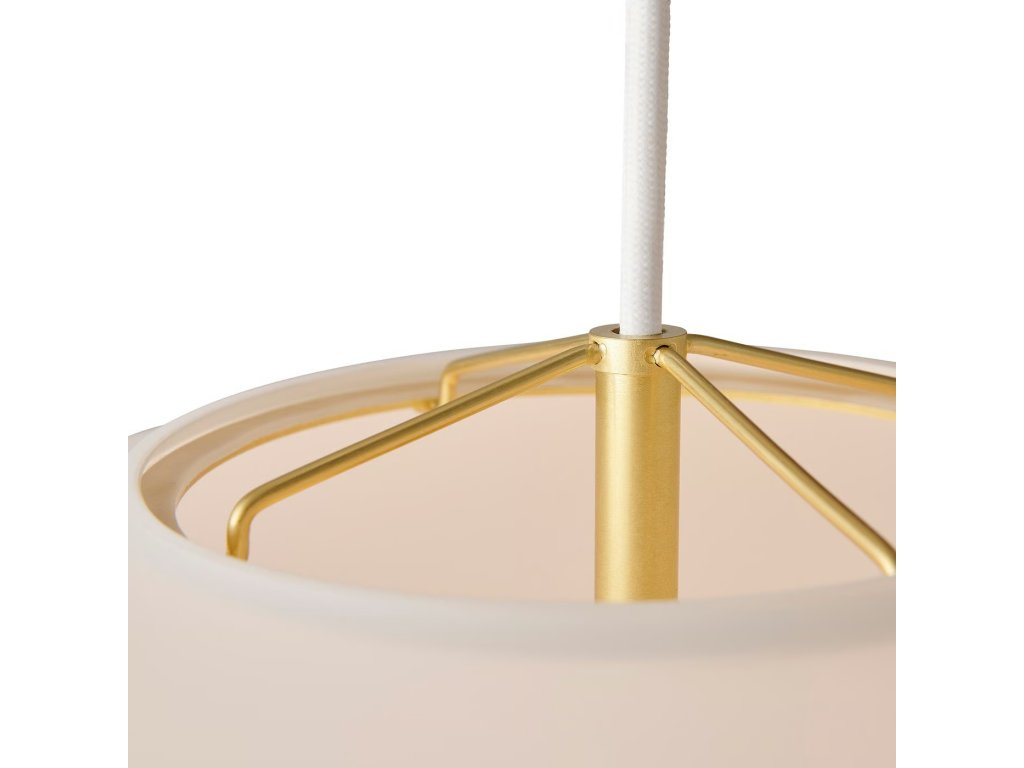 Závesné svetlo Navone 40 s okrúhlym organickým tienidlom, ktoré kombinuje mäkkú bielu a mosadzné detaily.