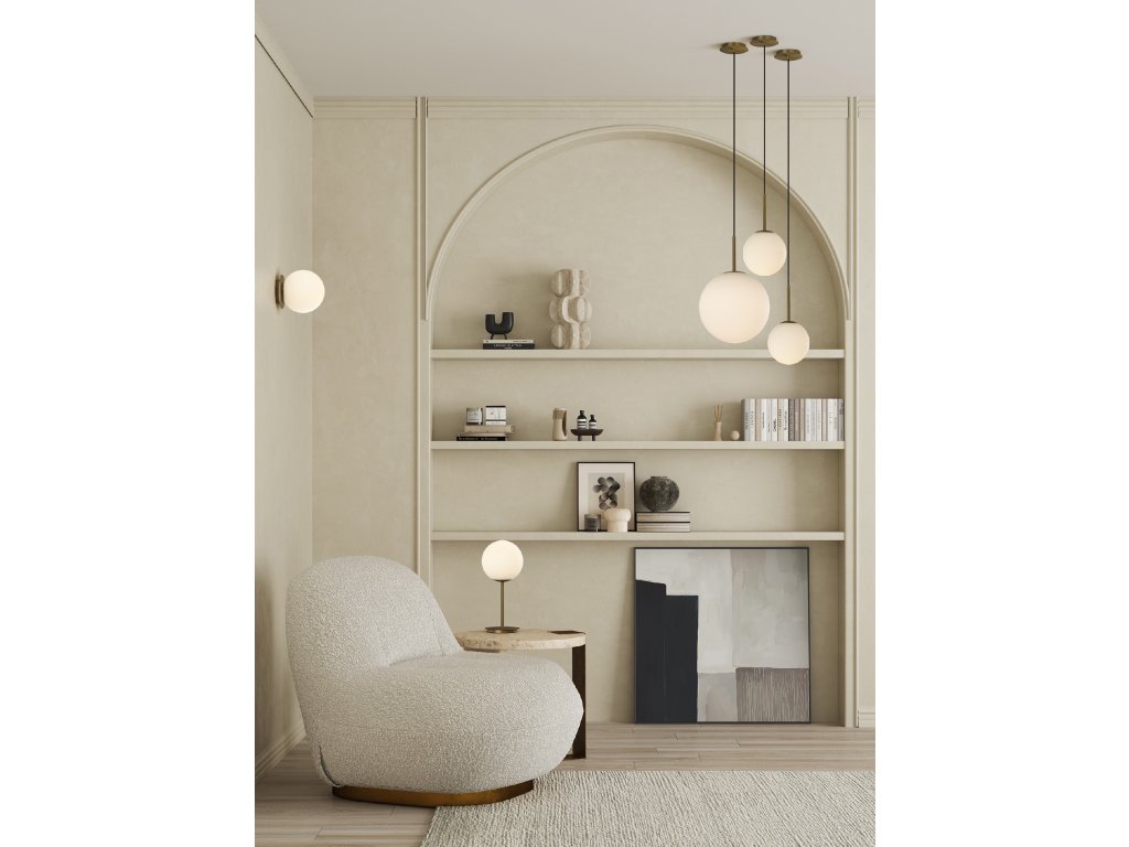 Toto svietidlo, dostupné v rôznych veľkostiach, je ideálne pre hlavné a elegantné osvetlenie s opálovým povrchom a detailmi v matnej zlatej farbe.