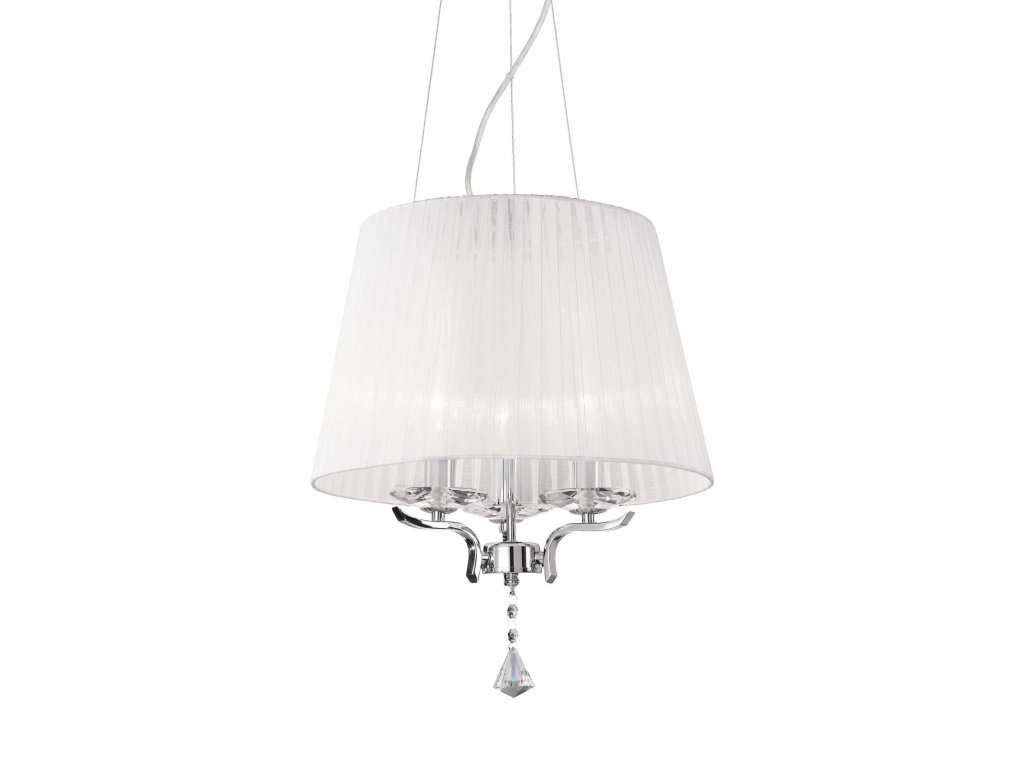 Závesné svietidlo Pegaso z kolekcie dizajnového osvetlenia značky Ideal Lux v klasickom prevedení s priemerom 40 cm je ideálnou voľbou na osvietenie obývacej izby, kuchyne či jedálne. Jeho rám je zhotovený z kvalitného kovu s chrómovou povrchovou úpravou. Telo svietidla je zdobené kalíškami a oveškami z čírych brúsených krištáľov. Tienidlo je vyrobené z bielej organzy a prívodná reťaz je krytá zamatom. Je osadené päticami E14 pre žiarovky s maximálnym príkonom 3 x 40 W. Zdroje nie sú súčasťou balenia. Odporúčame zvoliť LED žiarovky na úsporu elektrickej energie. Výšku závesu je možné regulovať od 51 cm do 260 cm. Krytie IP20 je vhodné pre vnútornú inštaláciu. Celkové rozmery svietidla sú 260 x 40 x 40 cm. Svietidlo je určené na napájanie zo siete na 220-240 V.Dodatočné parametre