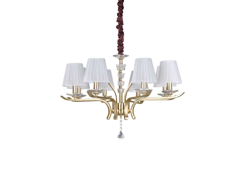 Závesné svietidlo Pegaso z kolekcie dizajnového osvetlenia značky Ideal Lux v klasickom prevedení s priemerom 76 cm je ideálnou voľbou na osvietenie obývacej izby, kuchyne či jedálne. Jeho rám a osem ramien je zhotovených z kvalitného kovu s mosadznou povrchovou úpravou. Telo svietidla je zdobené kalíškami a oveškami z čírych brúsených krištáľov. Tienidlá sú vyrobené z bielej organzy a prívodná reťaz je krytá zamatom. Luster je osadený päticami E14 pre žiarovky s maximálnym príkonom 8 x 40 W. Zdroje nie sú súčasťou balenia. Odporúčame zvoliť LED žiarovky na úsporu elektrickej energie. Výšku závesu je možné regulovať od 66 cm do 150 cm. Krytie IP20 je vhodné pre vnútornú inštaláciu. Celkové rozmery svietidla sú 150 x 76 x 76 cm. Svietidlo je určené na napájanie zo siete na 220-240 V.Dodatočné parametre