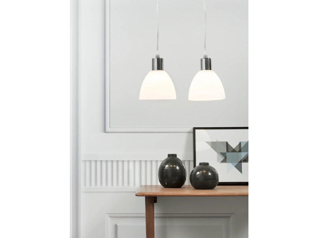 Svetlá sú vyrobené z bieleho lakovaného kovu so skleneným tienidlom. Biele sklenené tienidlo poskytuje mäkké a príjemné svetlo, ktoré sa hodí do mnohých priestorov v domácnosti. Použite ich ako dekoratívne svetlá v rohu, ktorý vyžaduje dodatočné svetlo, alebo ako svetlá na čítanie za kreslom. Svetlá je možné zavesiť spoločne, samostatne, v rozdielnej alebo v rovnakej výške - možností je veľa.