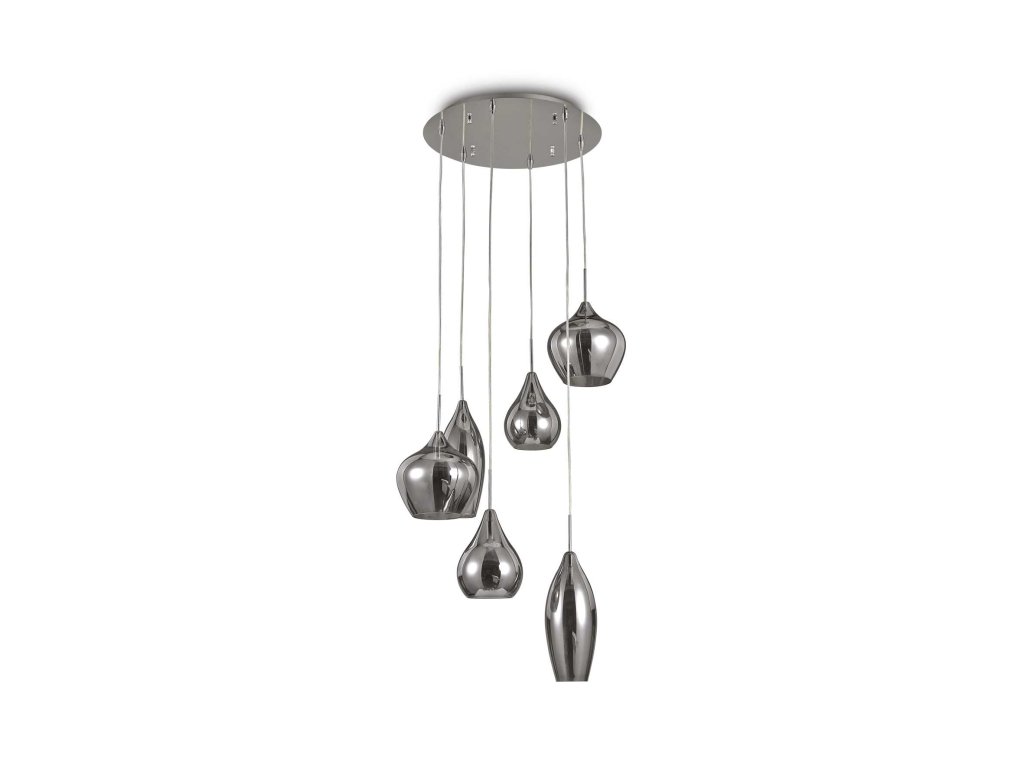 s guľatou základňou a priemerom 60 cm v dymovom prevedení ideálne rozsvietia obývacie priestory, jedáleň či kuchyňa v modernom i klasickom interiéri. - svietidlo sa skladá z kovového rámu a šiestich difúzorov z fúkaného dymového skla v rôznych tvaroch a veľkostiach.
