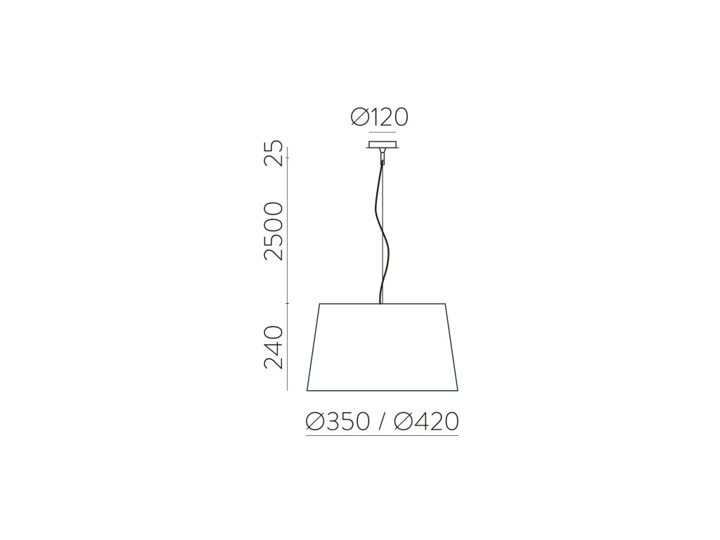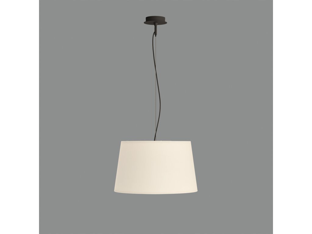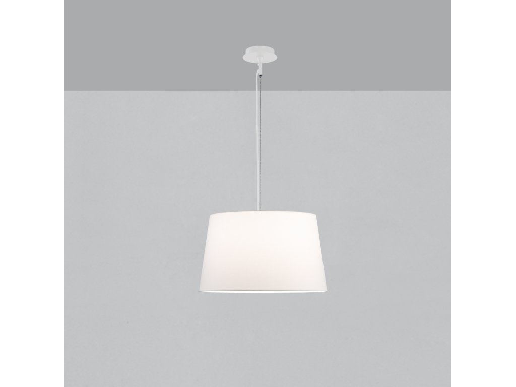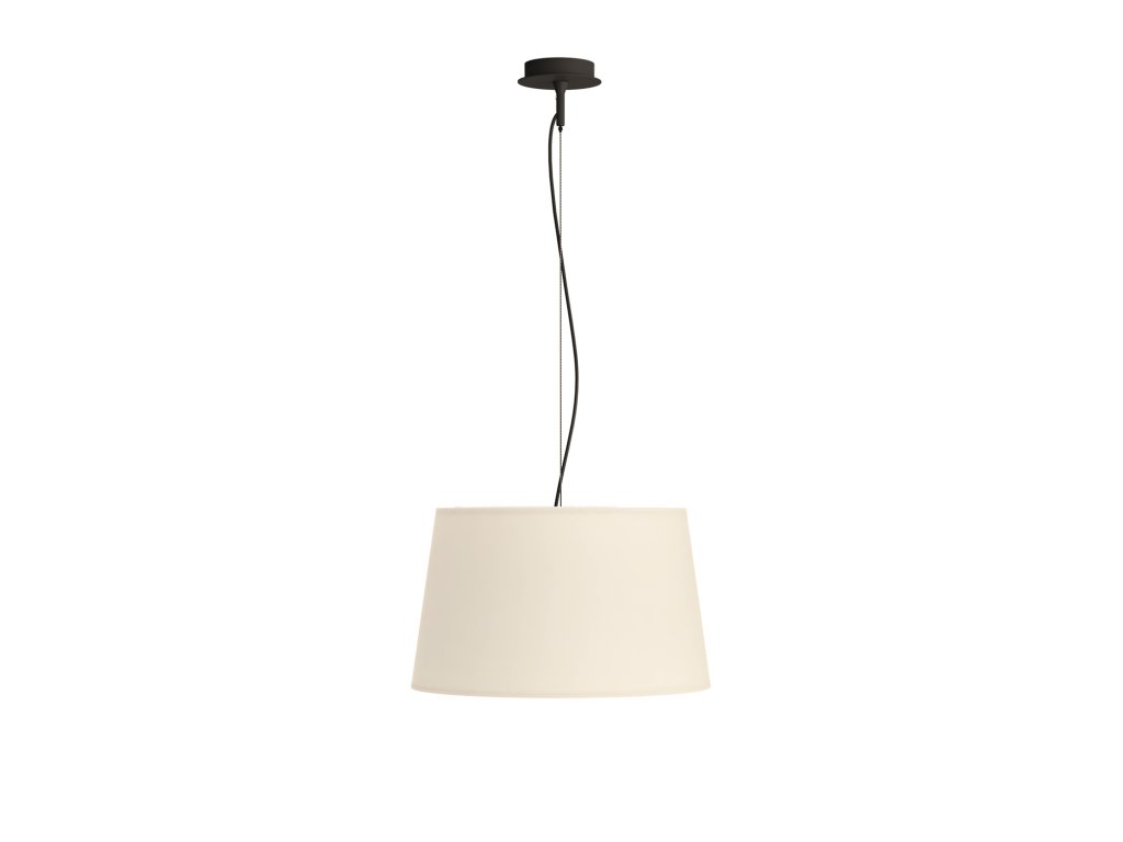 Moderné závesné svietidlo so štýlovým dizajnom zo série Stilo, vyrobené z guľatej kovovej základne a textilným tienidlom.