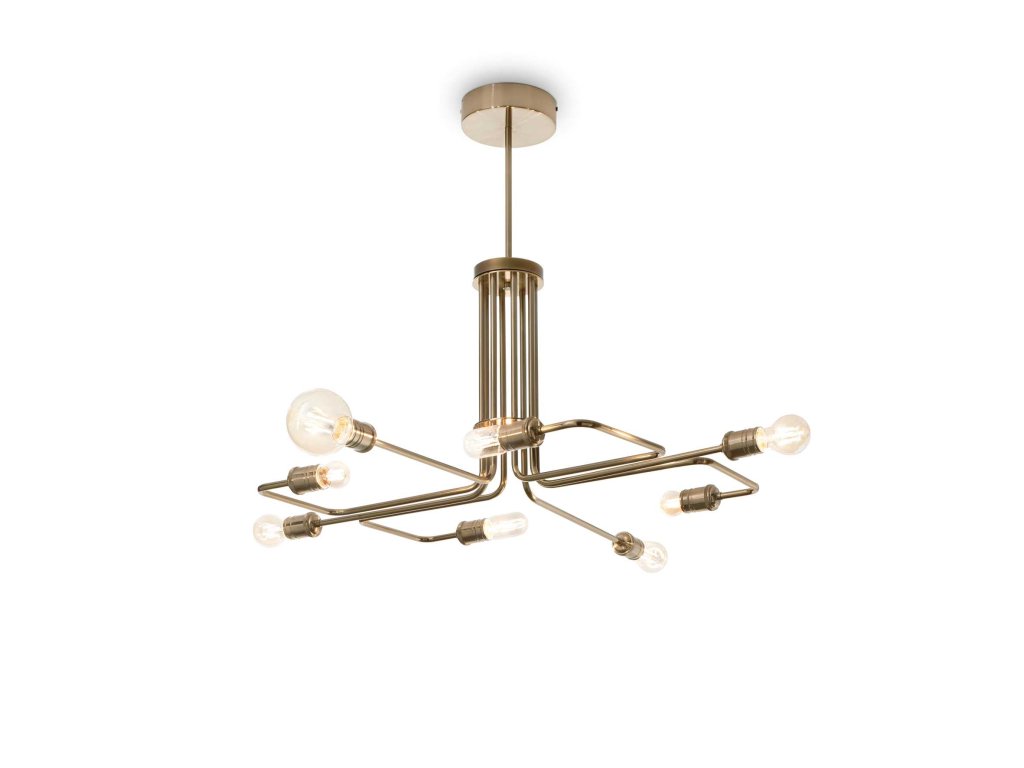 Zaujímavý závesný luster z kolekcie interiérového osvetlenia Ideal Lux s priemerom 92 cm zložený z ohýbaných trubiek do originálneho tvaru. Vhodný na nasvietenie obývacích izieb, kuchýň alebo spálne v rustikálnom, ale aj modernom štýle. Konštrukcia svietidla je kovová s antickou mosadznou povrchovou úpravou. Luster je na konci každej z ôsmich rúrok osadený päticami E27 s maximálnym príkonom 8 x 60 W. Žiarovky nie sú súčasťou balenia. Odporúčame zvoliť LED svetelné zdroje typu filament alebo vintage na zdôraznenie rustikálneho vzhľadu svietidla. Krytie IP20 je vhodné na použitie do interiéru.Dodatočné parametre