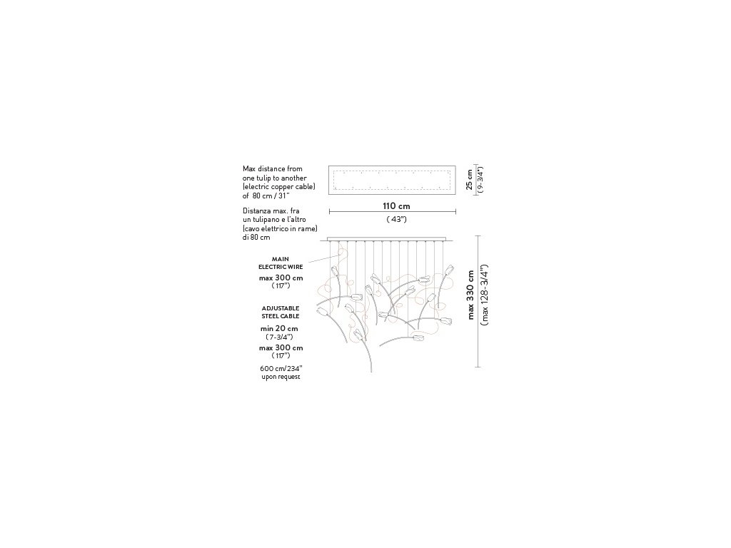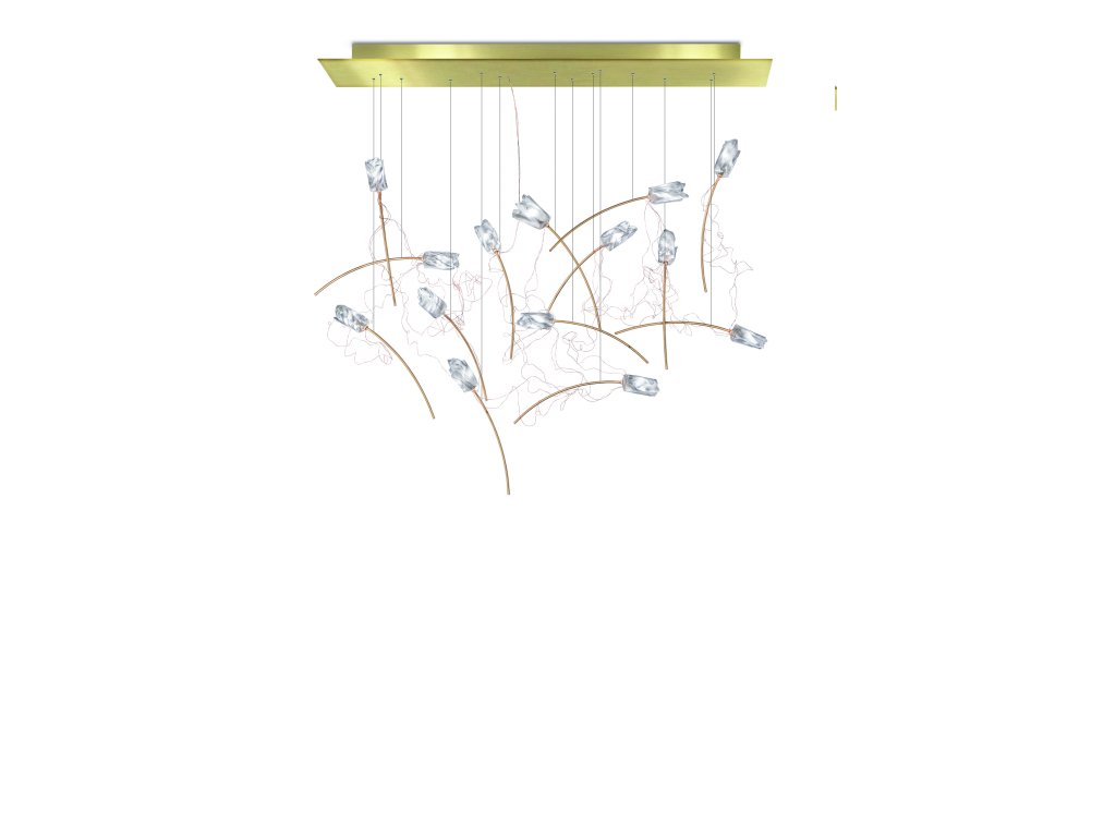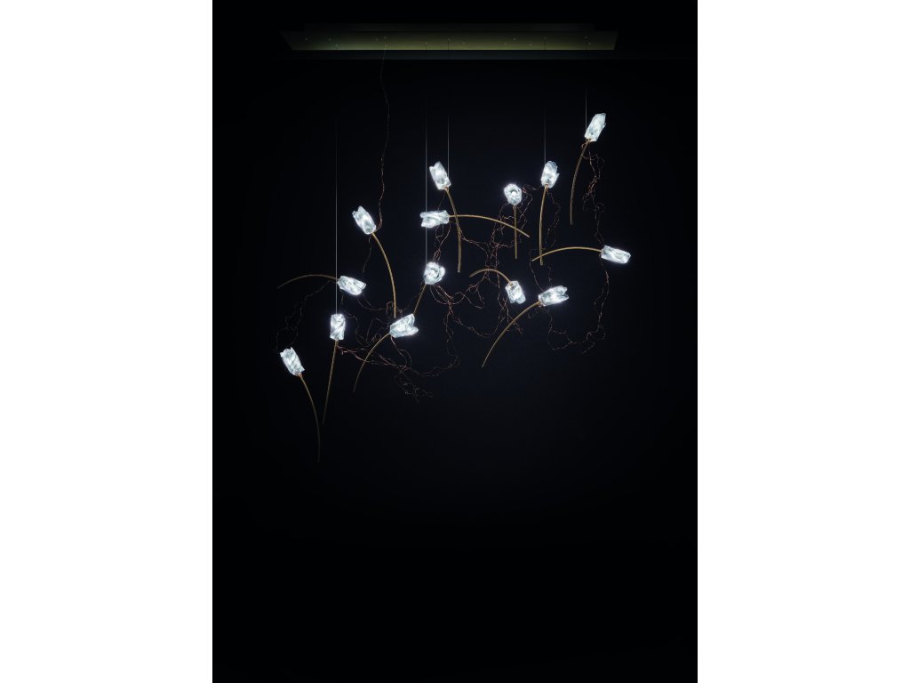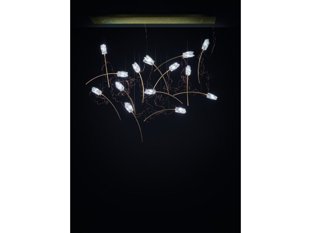- svietidlo tvorí takmer neviditeľné lanká pripevnené k obdĺžnikovej rozete (kefovaná mosadz), ktorá drží zavesené kvety rozkvitajúcich na stonkách z kefovanej mosadze a každý kvet je umiestnený v špecifických