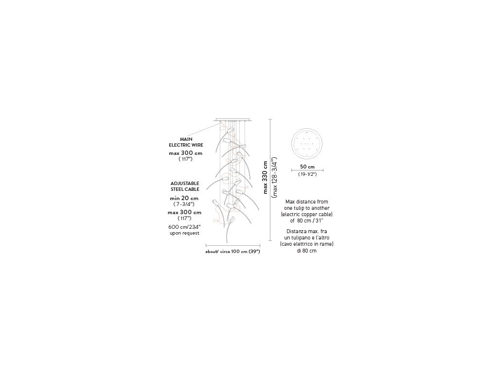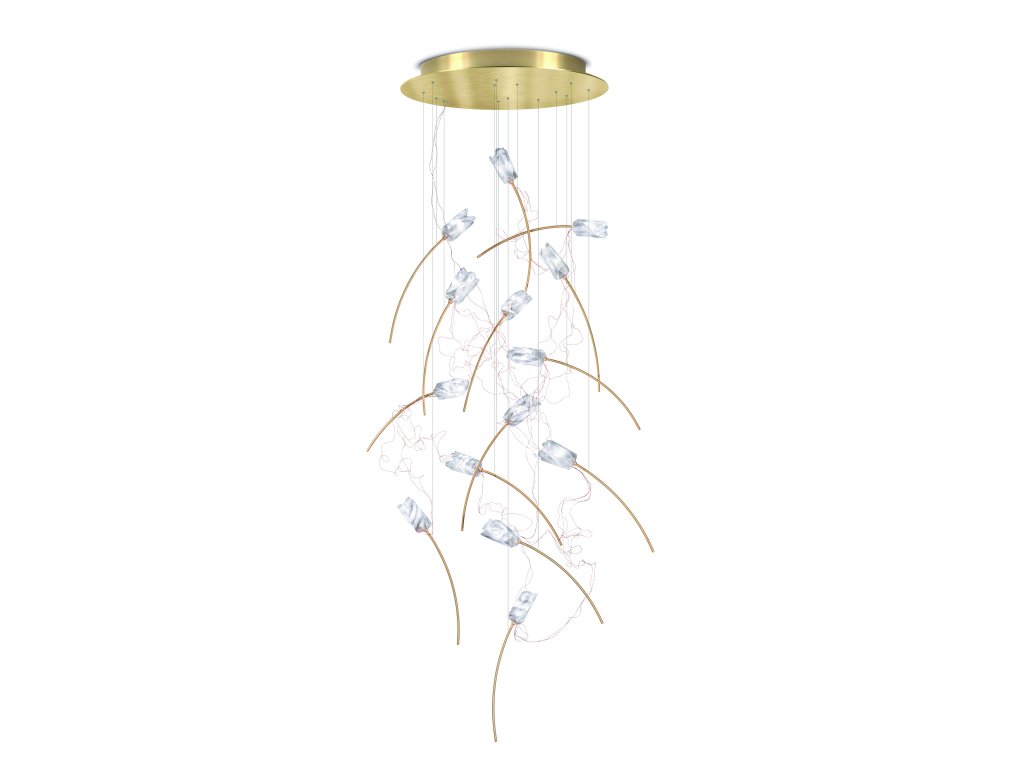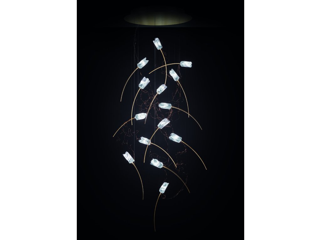- svietidlo tvorí takmer neviditeľné lanká pripevnené ku kruhovej rozete (kefovaná mosadz), ktorá drží zavesené kvety rozkvitajúcich na stonkách z kefovanej mosadze a každý kvet je umiestnený v špecifických