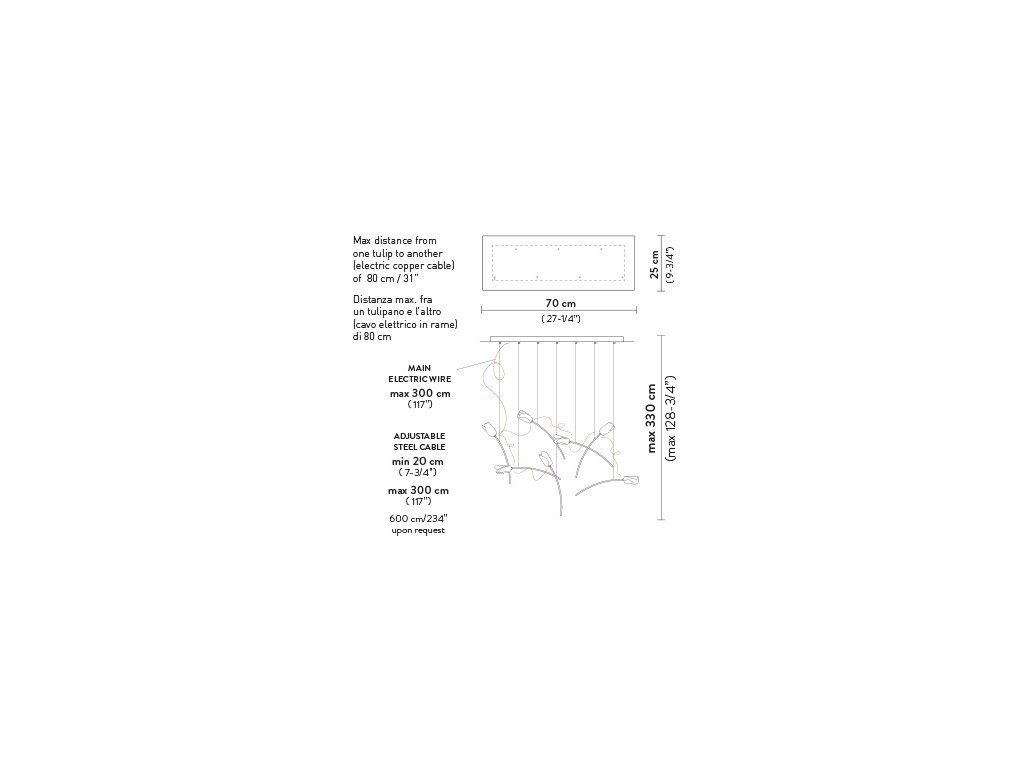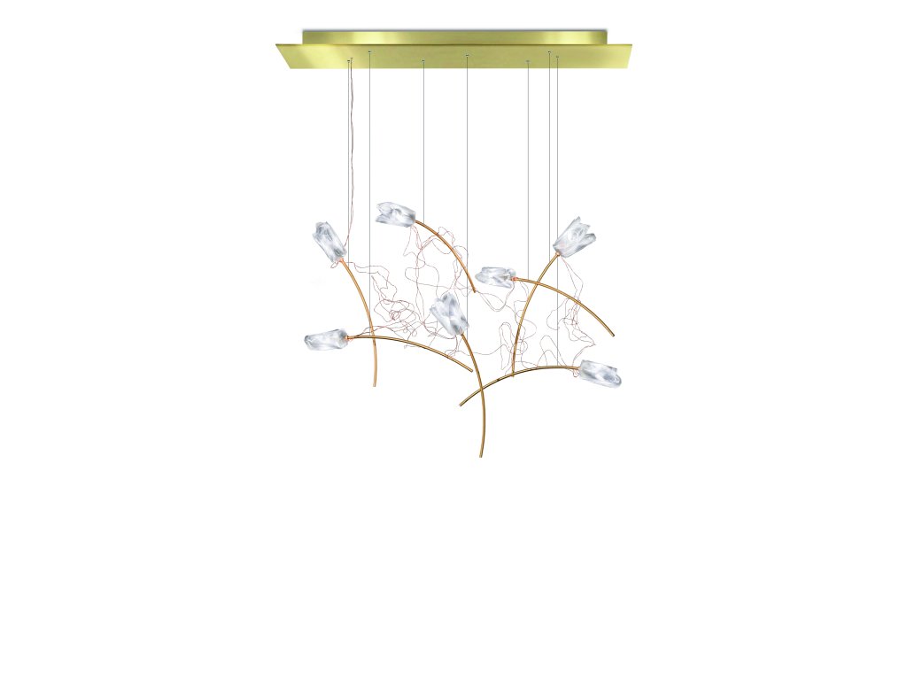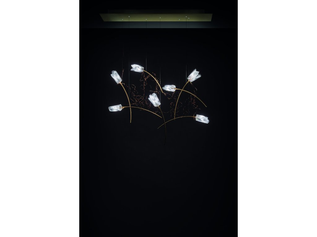 - svietidlo tvorí takmer neviditeľné lanká pripevnené k obdĺžnikovej rozete (kefovaná mosadz), ktorá drží zavesené kvety rozkvitajúcich na stonkách z kefovanej mosadze a každý kvet je umiestnený v špecifických