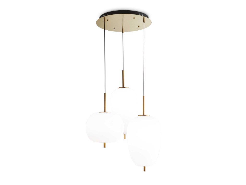 Elegantné závesné LED svietidlo Umile z kolekcie interiérového osvetlenia talianskej dizajnovej značky Ideal Lux skvele doplní svojim vzhľadom aj príjemným teplým bielym svetlom moderne aj tradične zariadenú miestnosť. Okrúhla stropná rozeta s priemerom 40 cm aj ozdobné akcenty tienidiel sú vyrobené z kovu s vonkajšou povrchovou úpravou vo vzhľade saténového zlata. Všetky 3 zavesené difúzory v rôznych veľkostiach a tvaroch sú z fúkaného skla s efektom bieleho leptania. Ich dĺžku zavesenia je možné ľubovoľne nastaviť pri inštalácii od 71 cm do 140 cm. Svit s teplotou chromatickosti 3000K zaisťujú integrované úsporné a vysoko výkonné LED diódy o celkovom maximálnom príkone 50 W so svietivosťou 3160 lm a dlhou životnosťou až 20.000 h, ktoré nie je možné vymeniť. Svietidlo je tak úplne bezúdržbové. Krytie IP20 označuje vhodnosť použitia tohto jedinečného lustra iba v interiéri.Dodatočné parametre