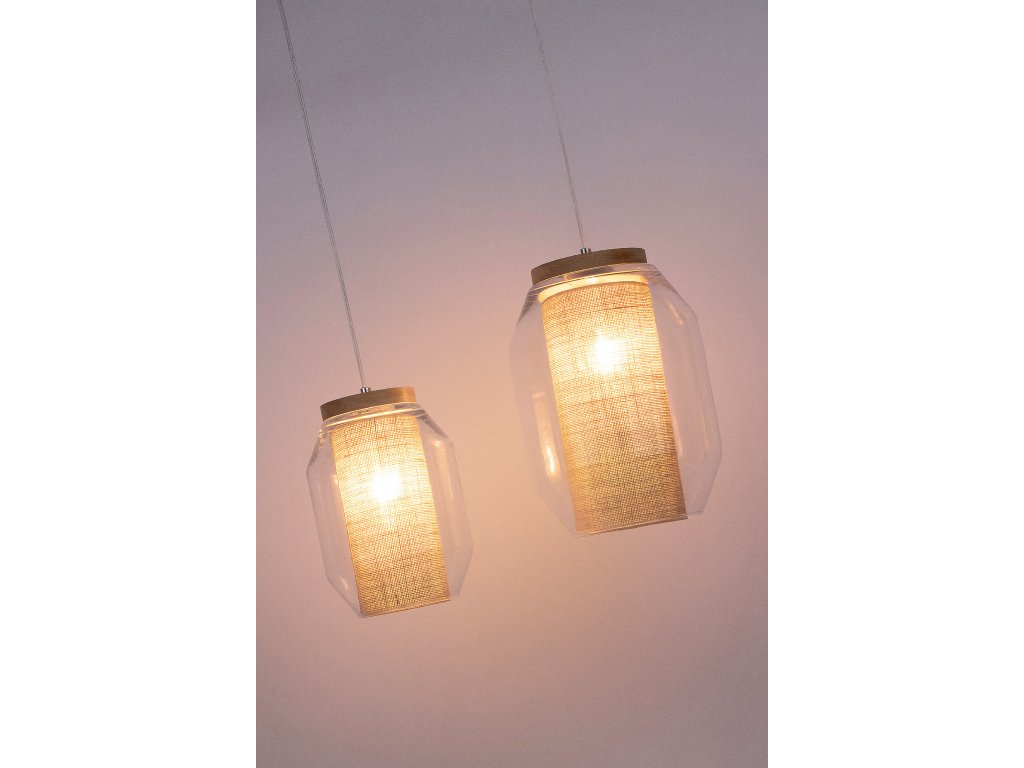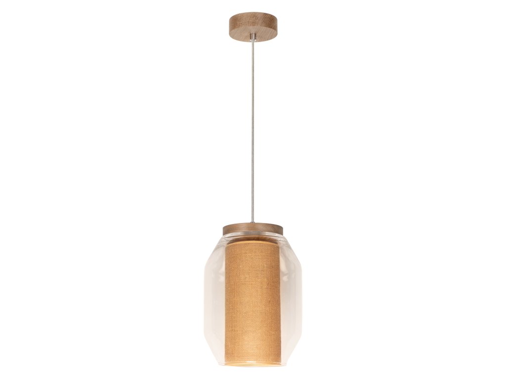 Závesné svietidlo VASO JUTE je elegantné a štýlové riešenie osvetlenia vášho vnútorného priestoru. Tienidlo je tvorené kombináciou textilu v béžovej farbe, číreho skla a olejovaného dubového dreva, čo dodáva svietidlu prirodzený vzhľad.