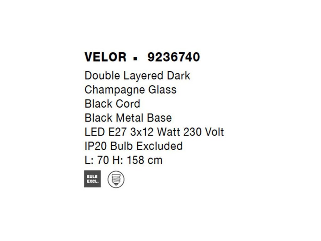 Závesné svietidlo VELOR je k dispozícii v zlato-čiernom a čiernom prevedení. Svietidlo je vyrobené z kovu, skla a povrazu. Rozmery svietidla sú 70x158 cm. Sklenené tienidlo má šírku 18 cm. Svietidlo odporúčame nad jedálenský stôl, do obývacej izby alebo spálne. Žiarovky E27 nie sú súčasťou balenia.Dodatočné parametre