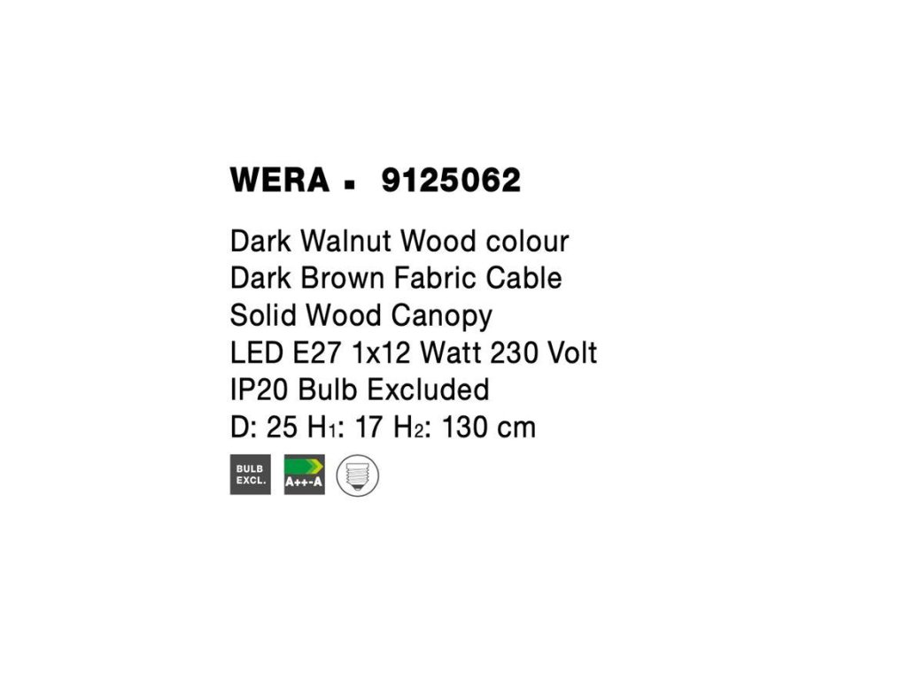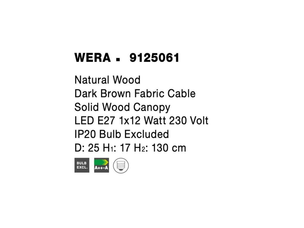 Závesné svietidlo WERA je vyrobené z prírodného dreva s káblom potiahnutým látkou. K dispozícii vo variante prírodné drevo a tmavý orech. Rozmery tienidla d25 x v17 cm, celková dĺžka svietidla je 130 cm. Svietidlo sa ideálne hodí nad jedálenský stôl, do obývacej izby alebo do spálne. Žiarovky E27 nie sú súčasťou balenia.