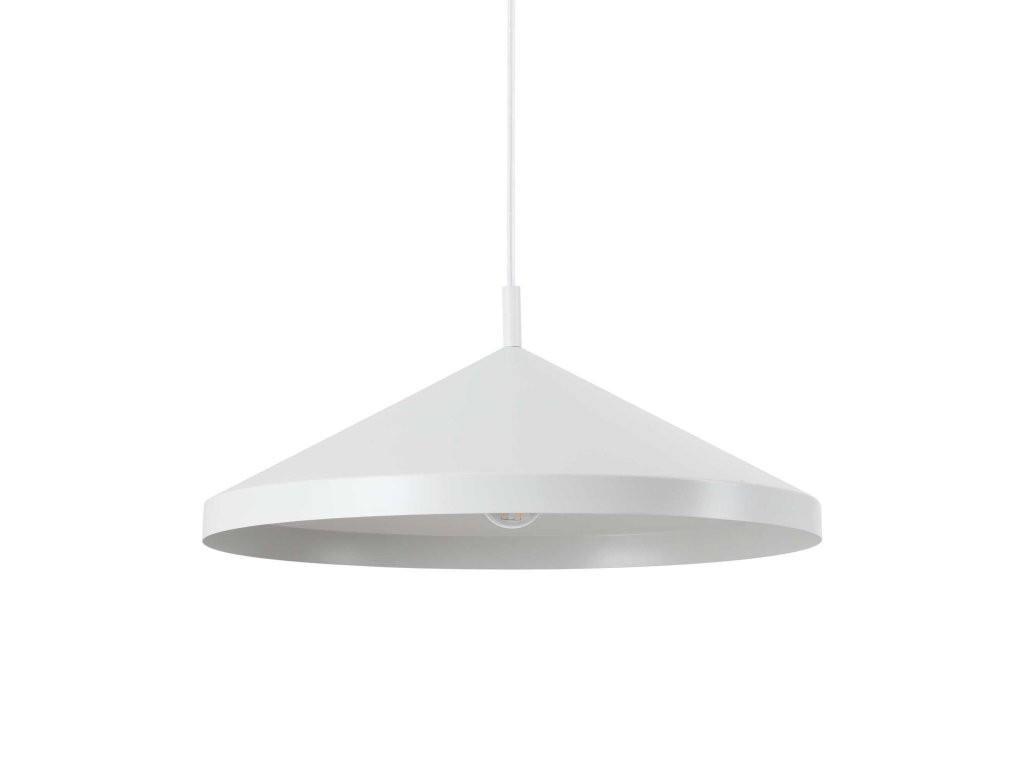 Závesné svietidlo YURTA z kolekcie moderného osvetlenia značky Ideal Lux v najväčšej verzii s priemerom 50 cm je určené na použitie v interiéri s krytím IP20. Jeho okrúhla základňa s priemerom 9 cm a tienidlo s výškou 17 cm sú zhotovené z kvalitného kovu s bielou povrchovou úpravou nanášanou metódou práškovania. Difúzor je zavesený na plastovom prívodnom kábli, ktorého výšku je možné regulovať. Celkové rozmery svietidla sú 232 x 50 x 50 cm. Svietidlo je osadené päticou E27 pre žiarovku s maximálnym príkonom 1 x 60 W (zdroj nie je súčasťou balenia). Svietidlo je určené na napájanie zo siete na 220-240V.Dodatočné parametre