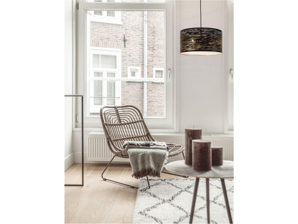 Závesné svietidlo ZANE je vyrobené z kovu vo vnútri v zlatej farbe a zvonku v čiernej. Tienidlo s priemerom 40 cm a výškou 20 cm. Celková výška tienidla je 120 cm. Svietidlo je vhodné do spálne či do obývačky. Žiarovky E27 nie sú súčasťou balenia.