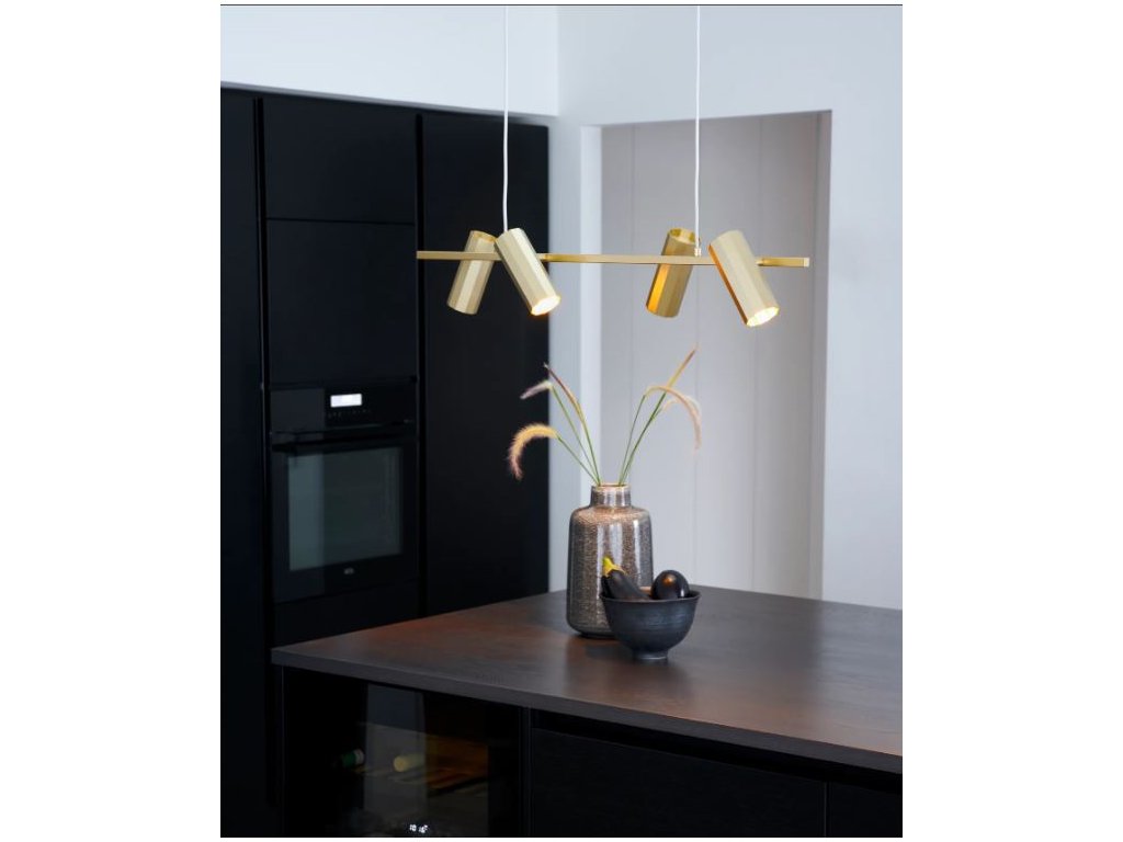 Moderné závesné svietidlo Alanis vás zaujme svojimi štyrmi tienidlami umiestnenými na lište.