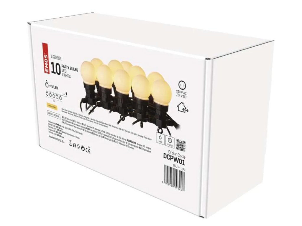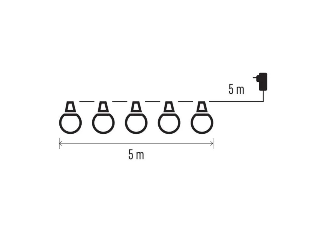 Vonkajšia svetelná reťaz s rôznofarebnými žiarovkami s dĺžkou 5m. Vďaka dlhému napájaciemu káblu s dĺžkou 5 m je jeho zapojenie do elektrickej siete hračkou. svadbách, kultúrnych akciách a pod. Vďaka vysokému stupňu krytia IP44 je svetelná reťaz vhodná do exteriéru alebo interiéru, alebo na terasy a párty osvetlenia. Reťaz má hrubý gumový plochý kábel a odolné termoplastové objímky so silikónovým tesnením. Produkt sa dodáva vrátane žiaroviek.